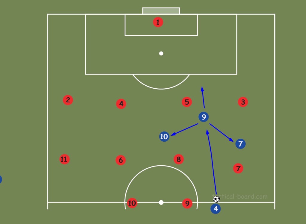 The number 9 in the example above can either receive the ball and turn or pass to either the blue number 7 or 10, who were previously unable to receive the all due to cover shadows of the red 7 and the red 8. Furthermore for the pass to be effective other factors such as the timing of the pass body positioning of the player and speed of the pass also play a part in effectiveness of the pass. Usually with zonal marking the opposition will, as mentioned before, aim for compactness vertically and horizontally which may mean the space between the lines is very small. To combat this the attacking team should use their striker/strikers to pin the oppositions defensive line and create space between the lines, that the inside forwards can take advantage of.