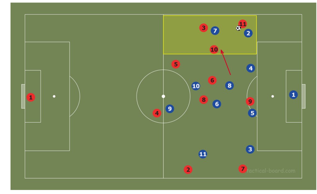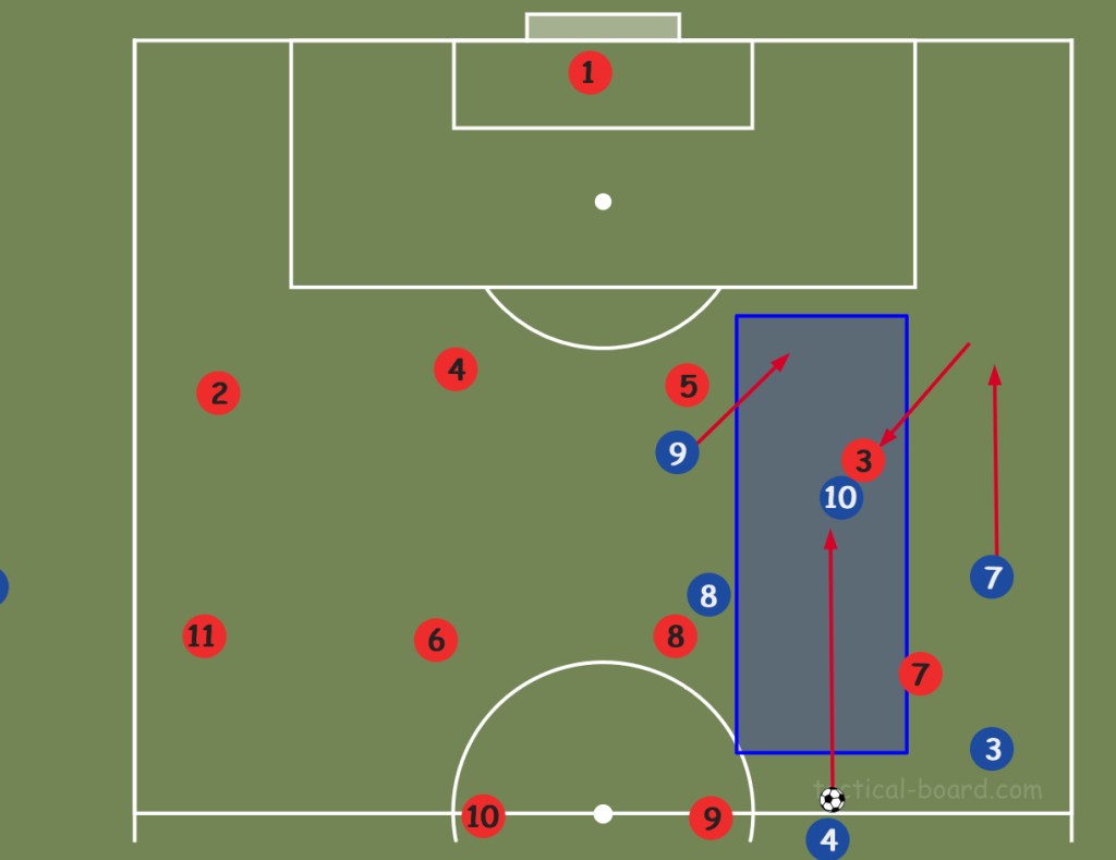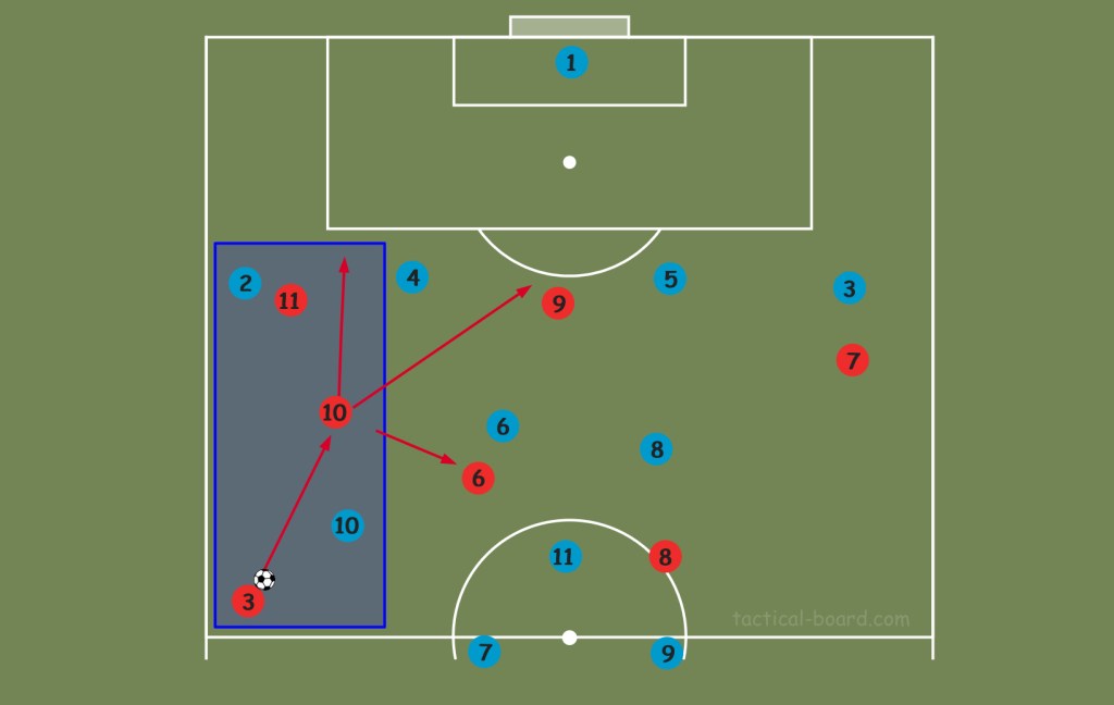 The number ten drifts to the left of the pitch to create 3v2, giving the number 11 an option for a pass and therefore allowing the number 10 to receive turn and find another pass.