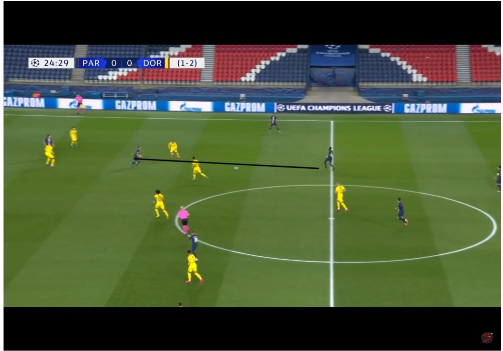 Dimaria is able to receive the ball between the lines and plays a pass in behind Dortmund’s defence, creating a scoring chance for Cavani. Positioning players in the half space can also draw defenders out of their positions, creating space for the attacking team to run into