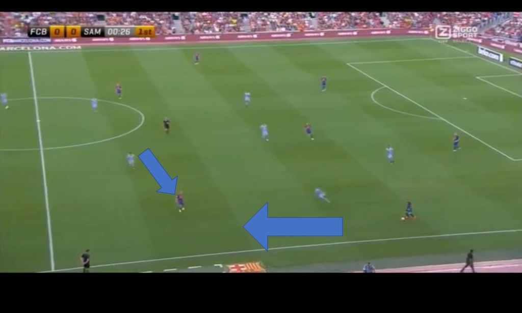 As Arda Turan(off screen) maintained a high position, pinning sampdoria’s right back high up the pitch allowing Iniesta to drift to the left flank creating a short but effective 2v1 overload, which helped them progress the ball through sampdoria’s first 2 lines of pressure