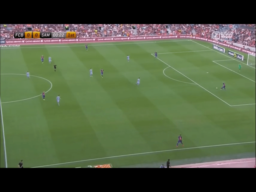 Quagiarella, sampdoria’s Right striker prevents a pass to Iniesta from the defence into the midfield, forcing the defender to play the pass to the full back. Here the aim of Sampdoria is to protect the middle and force Barcelona out wide, where they would then attempt to win the ball back.