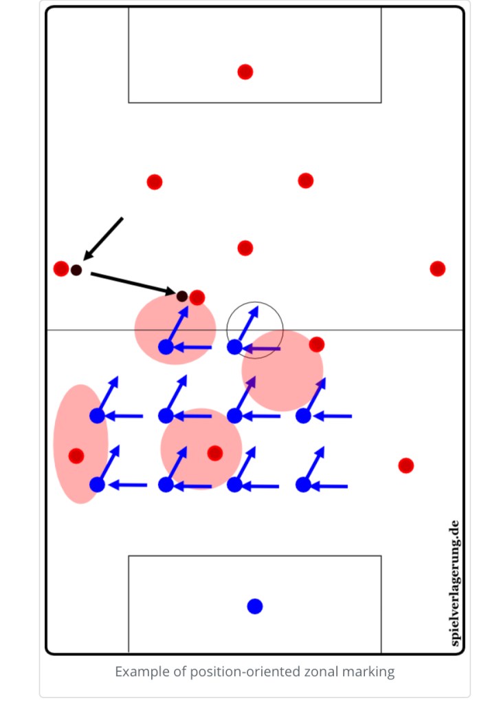 The opponent is approached slowly and step by step, which sometimes seems a bit laid-back. Despite the passivity and reduced access, however, the block remains stable and compact. Passes into the space between the lines are difficult and can be compressed by narrowing the team’s spacing.” – from zonal marking/zonal coverage article by Rene Maric Spielverlagerung.com
