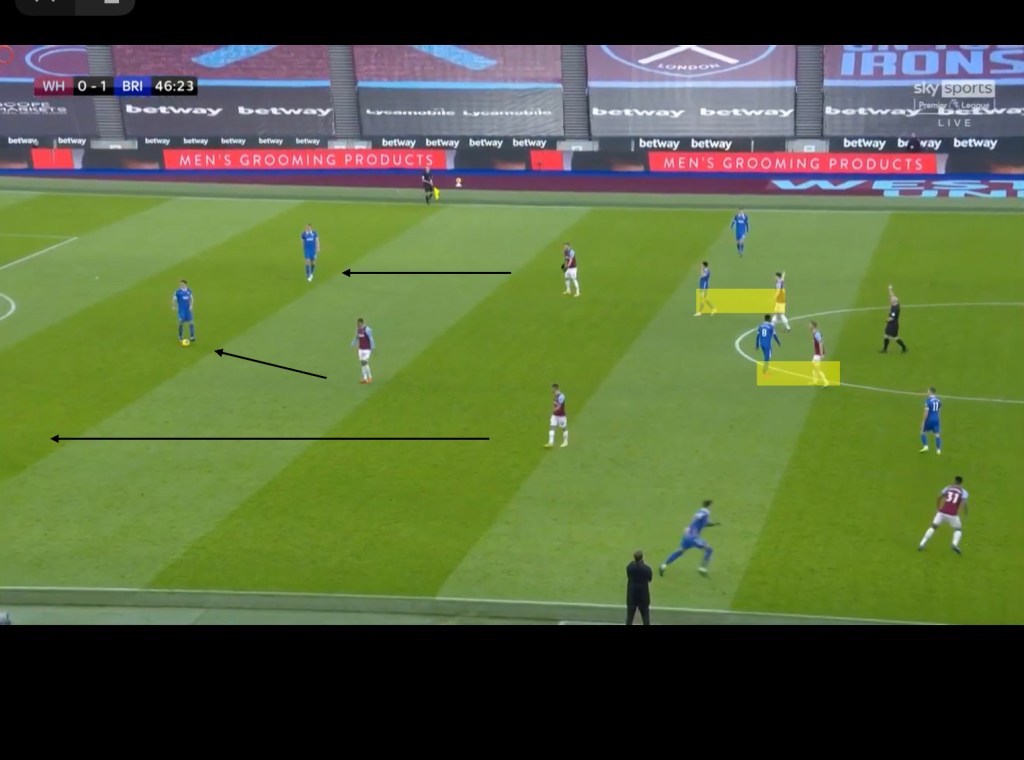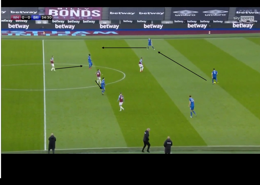 Backwards passes from the Brighton players, were used as triggers for West Ham’s front three to press Brighton’s back three. The switch of approach from West Ham meant it was difficult for Brighton to circulate the ball at the back and play passes into the midfield, and as a result, Brighton were forced to play long balls further up the pitch which did not always find their targets.