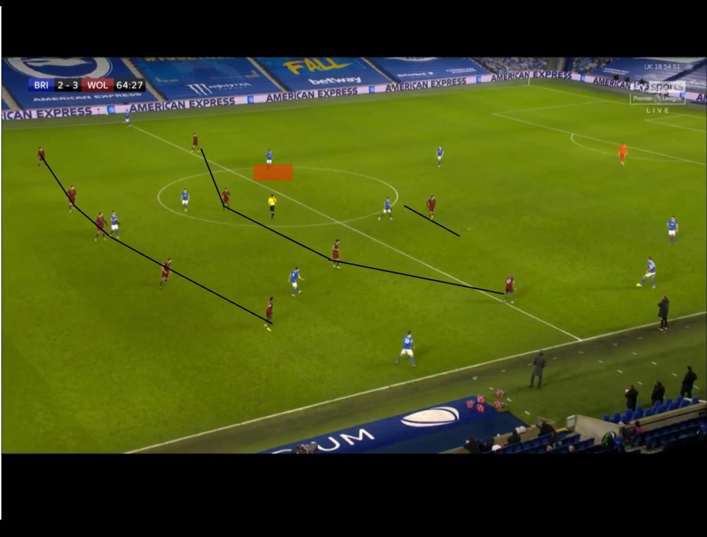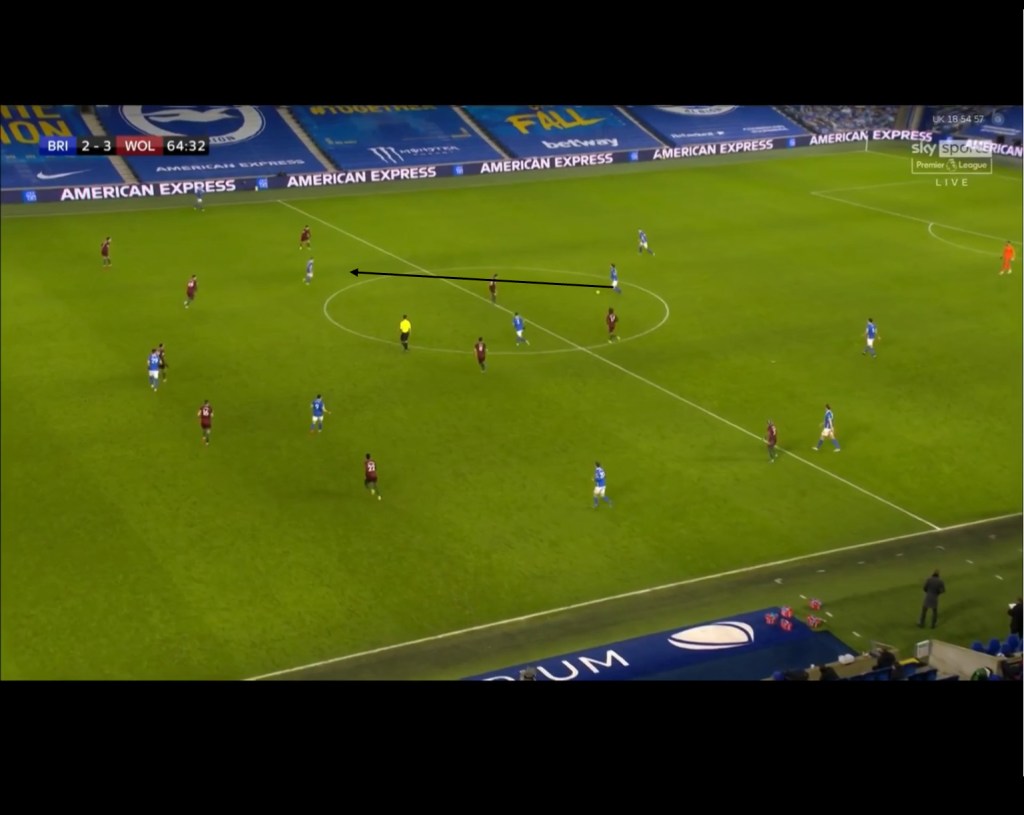 This could be seen in the later stages of a game against wolves earlier on in the season, where wolves pressed Brighton in a man oriented 5-4-1 mid-block. By the 60th minute, wolves were looking to hold onto to their lead and dropped their pressing further down the field, allowing Brighton to play further up the field. With Fabio Silva as the lone striker,occasionally pressuring the back 3, the seagulls were able to easily circulate the ball at the back and could drive further into the midfield unopposed. In the picture below, we can see a scenario where Dan burn is in possession of the ball, slightly ahead of his other two centre back partners. Maupay has dropped slightly deeper into the midfield and as a result, Ruben Neves has slightly adjusted his body position to be in a position to potentially intercept a ball played to him. Moutinho would orient his body position to Trossard, while Silva orients himself to Ben White and as a result of this, Davy Pröpper(highlighted) is left free in the midfield. Neto, the wolves winger could step infield and position himself close to Pröpper but that would leave a channel open on the right hand side, that could be exploited by a quick switch to Webster who is excellent at carrying the ball forward into midfield.