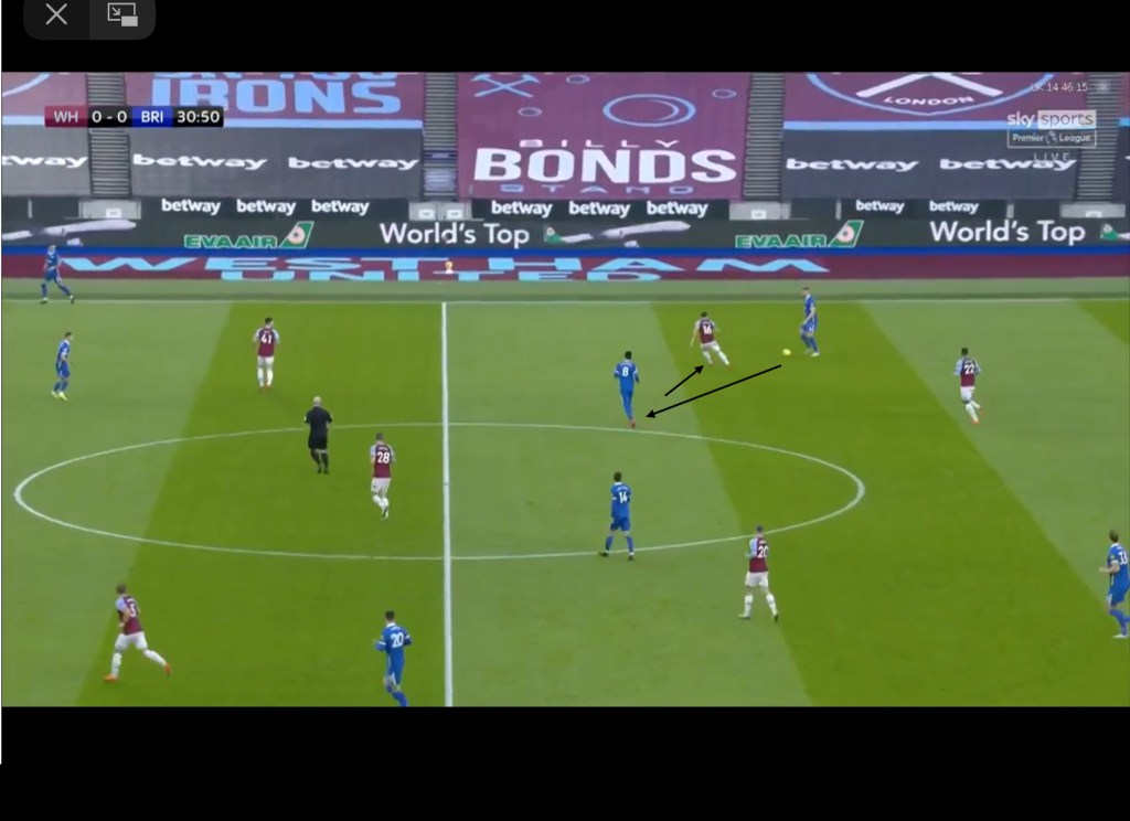 The benefit of having the stretched back 3 is the fact that if one of the midfielders steps out to apply pressure, the opposing teams pressing lines will be stretched, creating space for midfielders to receive the ball. This can be seen below as after a switch to Webster, Noble hurriedly pushes up to press Webster to prevent him from driving forwards into the space. However, by doing so Bissouma is now able to receive the ball in the midfield.