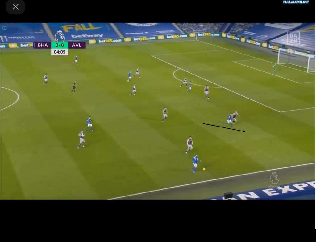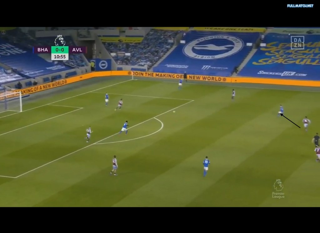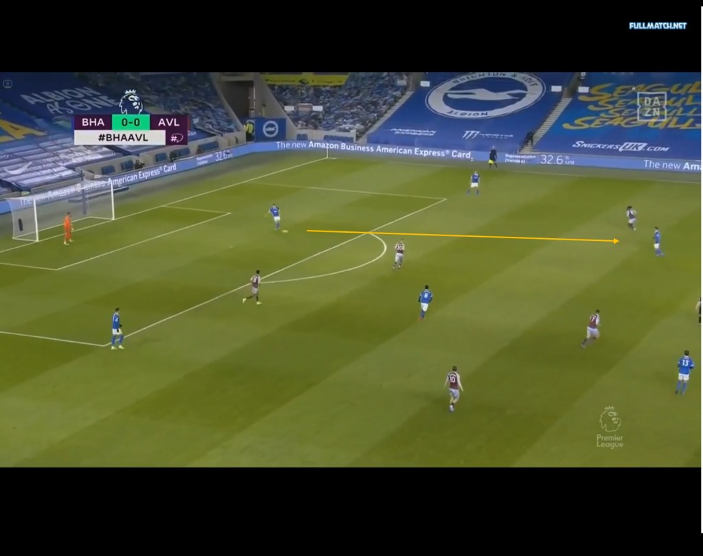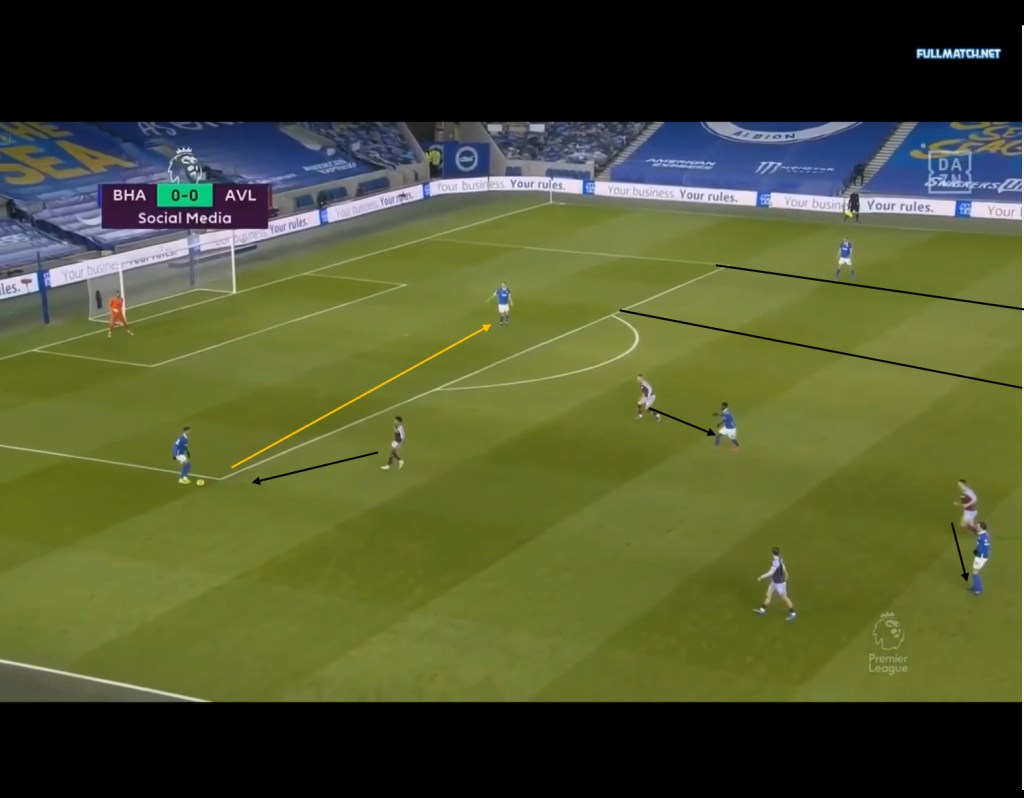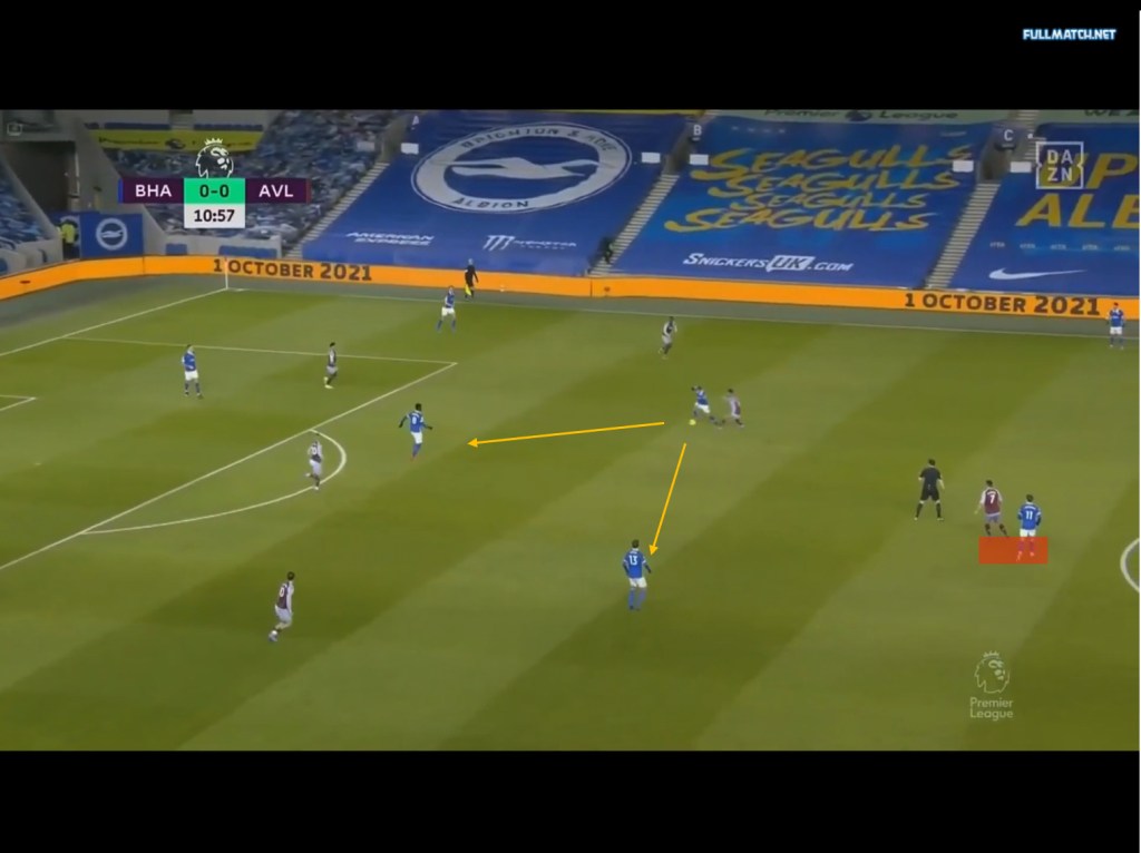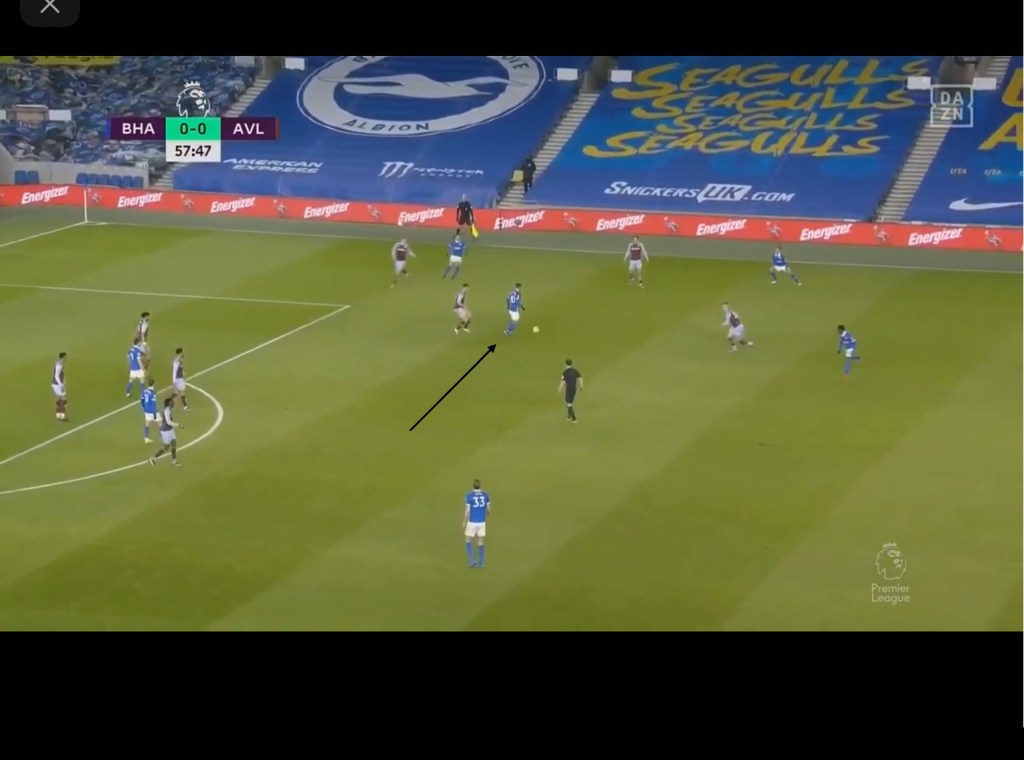 With the switch, the seagulls are once again able to gain a numerical advantage in the midfield and due to the higher positions of the two midfielders, the deeper half spaces are left vacant and this combined with the numerical advantage in the midfield allows the midfielders to arrive into the half spaces and play layoffs or pass to the free man. This could be seen against Aston Villa, with Villa’s press drawing many similarities to that of Chelsea’s mentioned earlier. As seen below, Villa pressed in a 4-4-2 with the front two alternating in pressing the CB ball carrier and covering Bissouma in the midfield, with McGinn orienting himself to Pascal Groß. On Brighton’s left side of the field, we can see how the area that used to be occupied by one of the midfielders in the double pivot is now empty.
