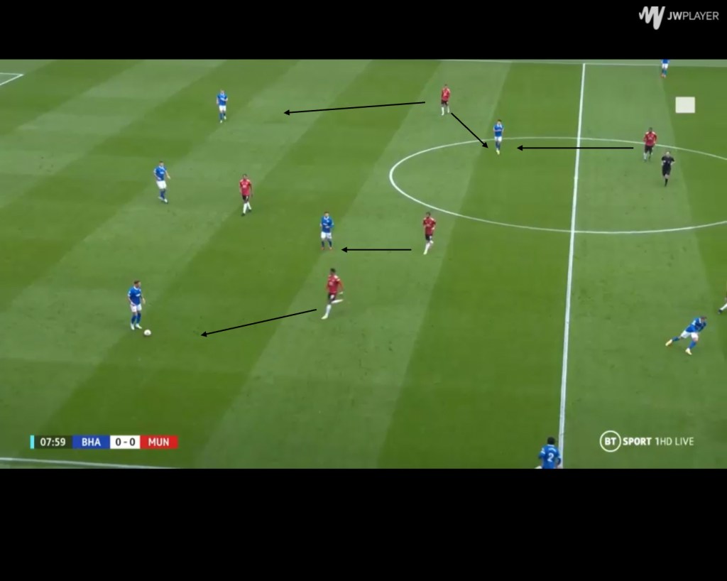 The West Ham game was not the only situation where Brighton failed to progress the ball as comfortably as they would’ve liked. Brighton also struggled to progress the ball cleanly in their game against Manchester United. Although Brighton were the better team against United, and should have comfortably won the game, United managed to force Brighton backwards and sideways in the build up and below we can see why. Manchester United pressed in a 4-2-3-1 and created a 3v3 in midfield whenever they shifted from side to side, with Fernandes marking the ball near central midfielder in the double pivot. Rashford would move from an inward position outwards to press Ben White and prevent him from carrying the ball forwards forcing him to play a pass to the WB, Lamptey, while Matic would follow the movements of Trossard, preventing him from receiving the ball in between the lines. Martial stayed close to Dunk, which would potentially force Ben White to play a deeper pass to the goalkeeper when recycling possession, allowing United’s press to advance further up the field. By forcing Brighton out wide, United could favorable opportunities to regain possession and although Brighton, throughout the season have not shied away from playing long balls at times, United’s press instigated the use of longer passes more often.