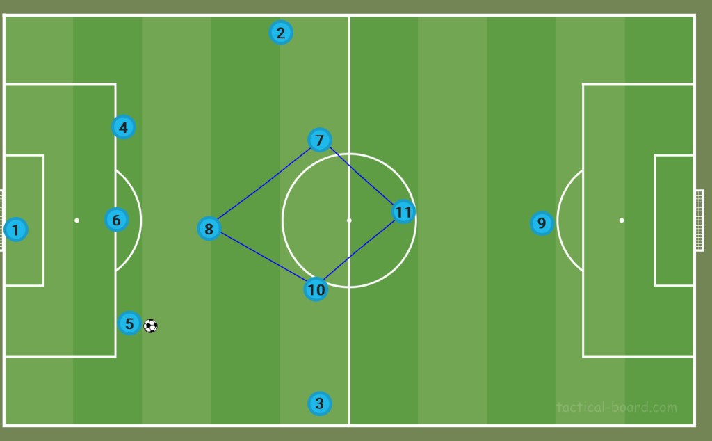 As the ball is passed to left side of the defence, Mac Allister now drops into the half space to receive the ball. Trossard’s positioning at the tip of the diamond delays Douglas Luiz from instantly applying pressure to Mac Allister and deterring pass the pass to him.
