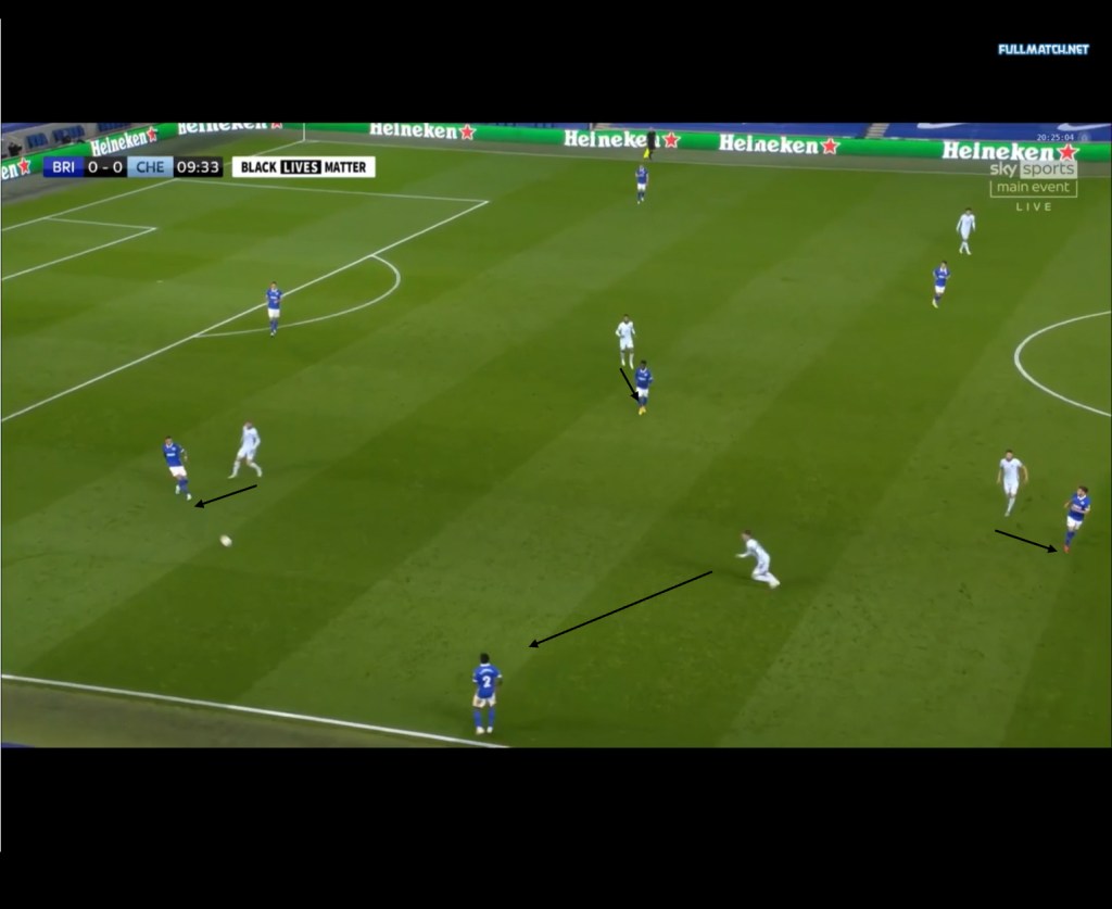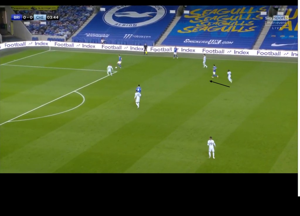 A similar scenario where Brighton were forced out wide occurred in a game against Chelsea at the start of the season. Chelsea pressed in a 4-4-2 and although this formation has a two man midfield, Chelsea’s front 2 would alternate in marking Bissouma in the double pivot, while the other forward would press the ball carrying CB and Jorginho would stay deeper to follow the movements of Lallana who was playing the “Trossard role” and as a result, Brighton would not be able to have numerical superiority in the centre.
