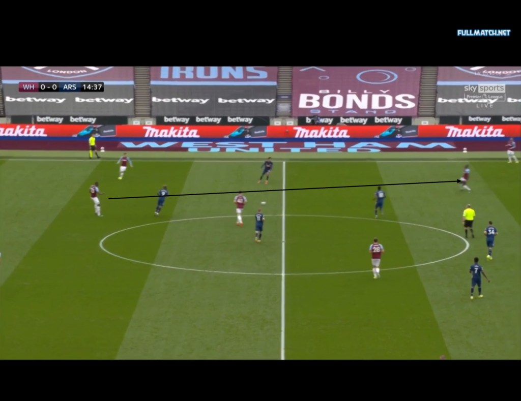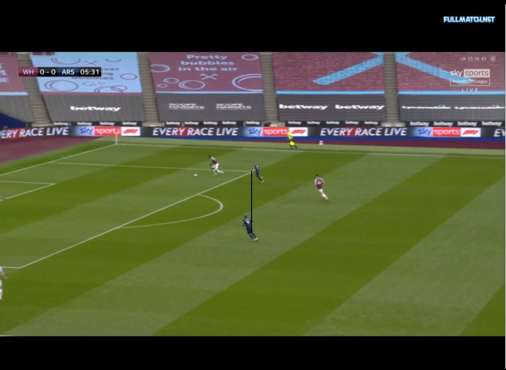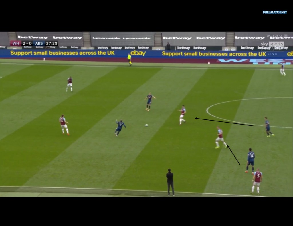 Arsenals main problems this season in their defensive structure have come from the side’s lack of compactness vertically and horizontally, and as mentioned earlier, this directly affects the other roles and fundamentals when defending. The first example of this could be seen in arsenals 3-3 draw against West Ham in which Mikel Arteta’s side pressed in a 4-4-2, a formation which Arsenal have used more often recently. West ham during build up played with a 4-1-2-3, with Rice either occasionally dropping between the CBs or operating as a single pivot, while Soucek would remain in central midfield, with Jesse Lingard occasionally dropping deeper from his attacking midfield position. As seen below, there is so much space between Arsenal’s 1st and 2nd defensive line an Evergeen container ship could fit between them, as Odegaard and Lacazette push higher up the pitch to press, but Arsenal’s 2nd line of defence did not follow suit.