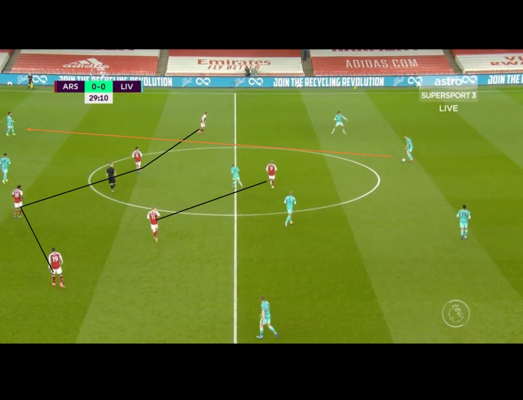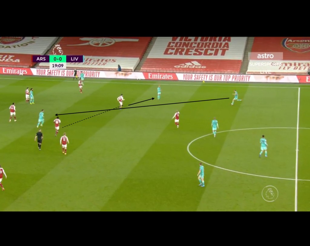 In the example below we can see how Aubameyang’s orientation towards the RB opens up a passing lane in the half space. Thiago from this position could then lay a pass of to Alexander-Arnold on the wing who was then able to create a quality chance for the reds.