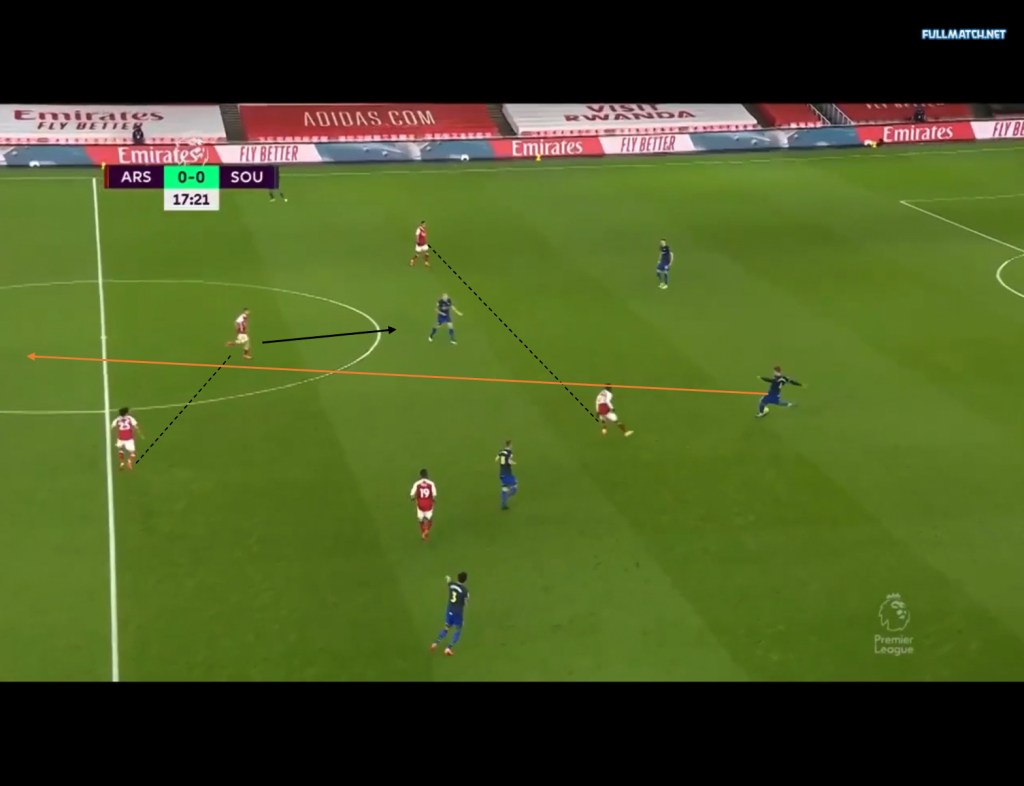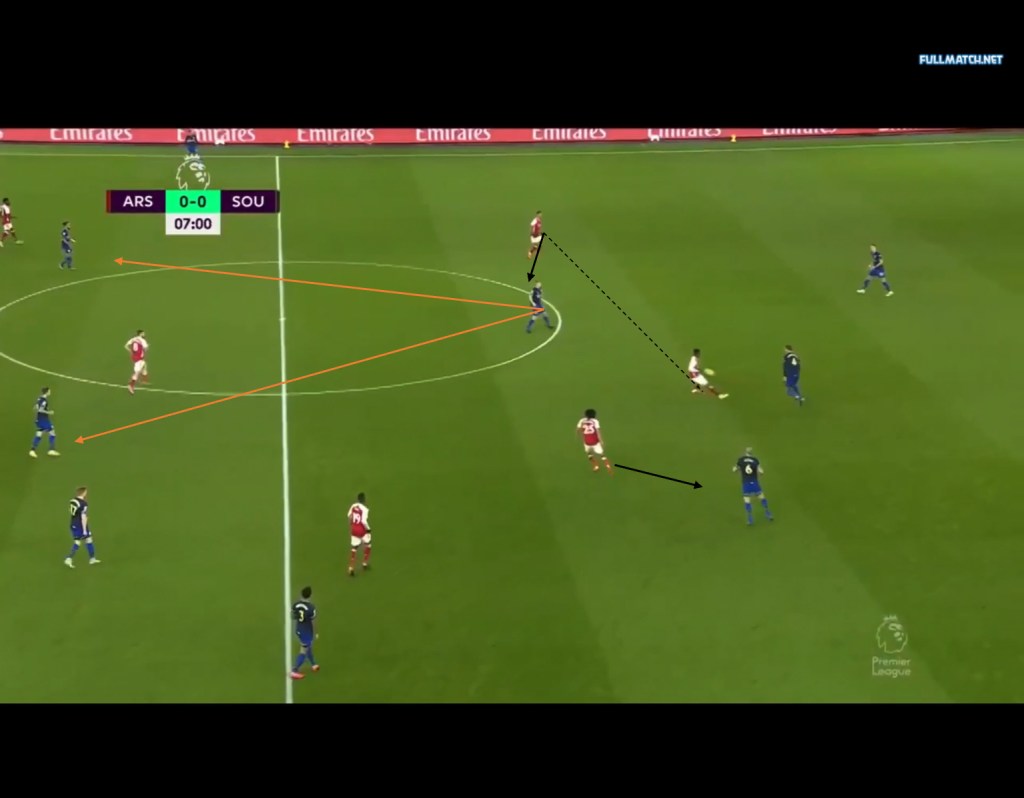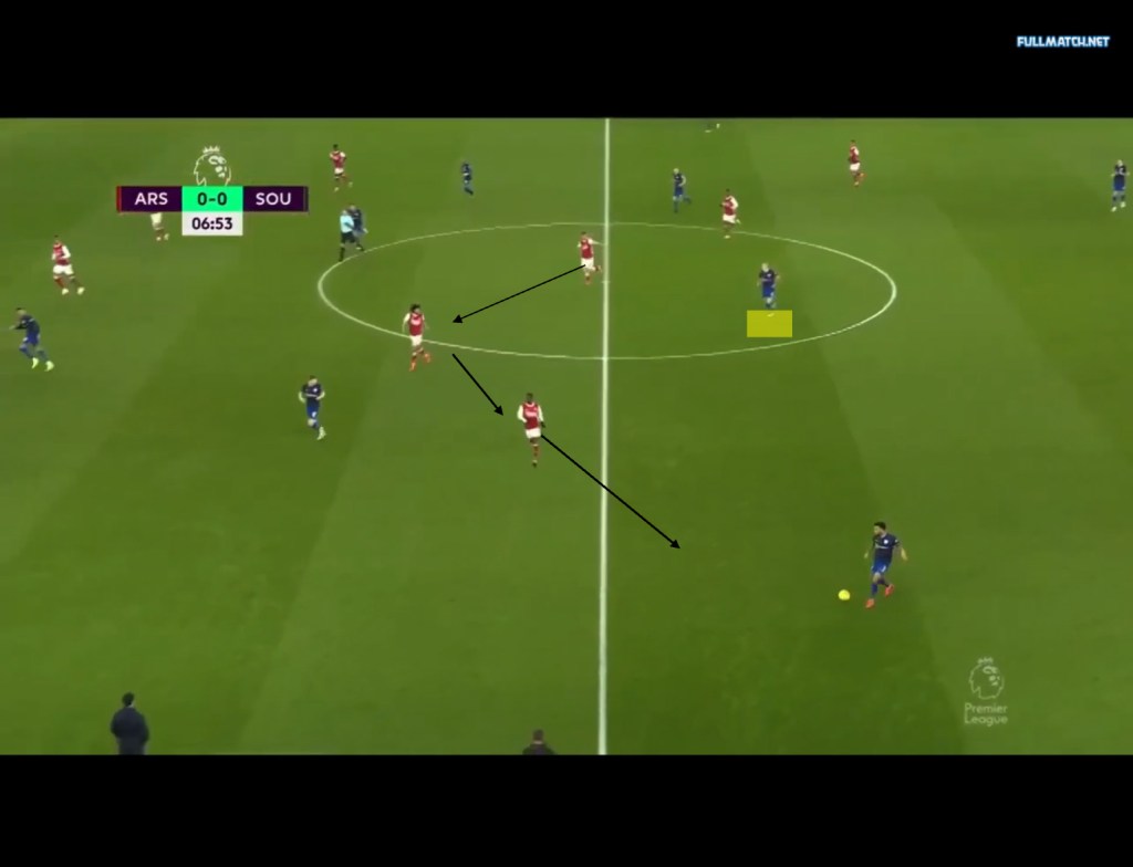 Aubameyang’s widened position meant Arsenal’s central midfielders had to press Southampton’s midfield pairing, creating gaps in the centre. This could be seen in the Southampton’s first goal, as Ceballos orients his position towards Romeu, thus increasing the gap between him and Elneney. This allowed Vestegaard to play a pass into Che Adams who would then play a pass to Walcott for the first goal of the game.