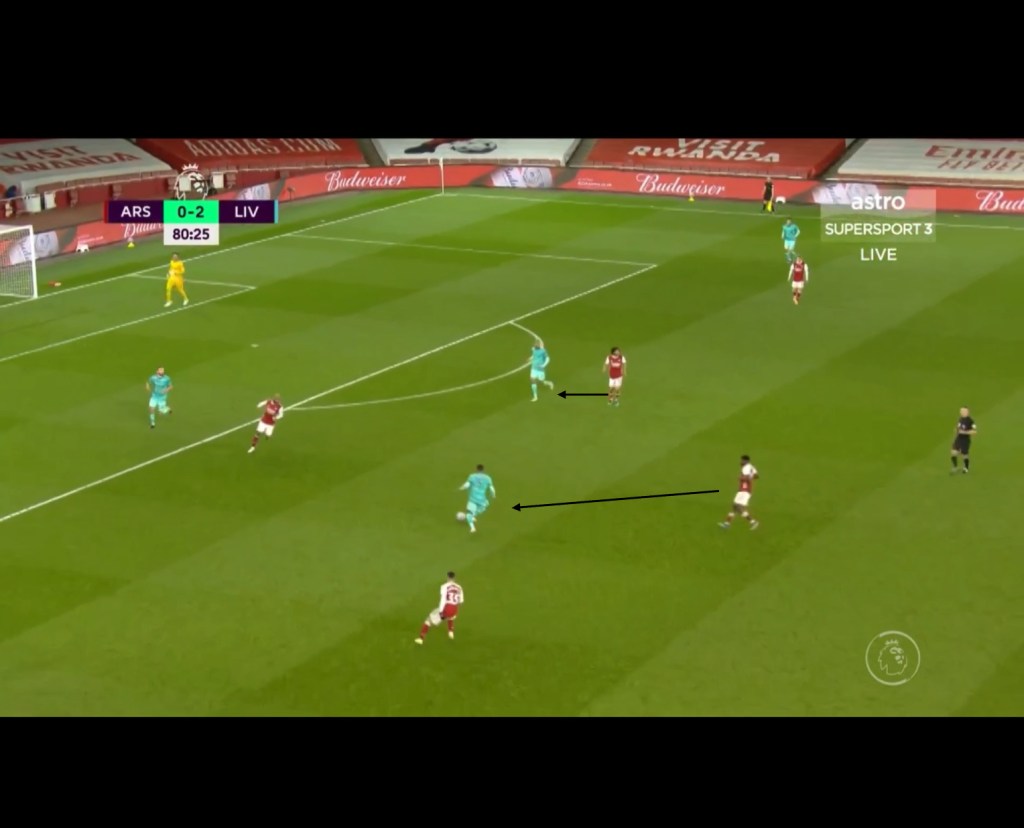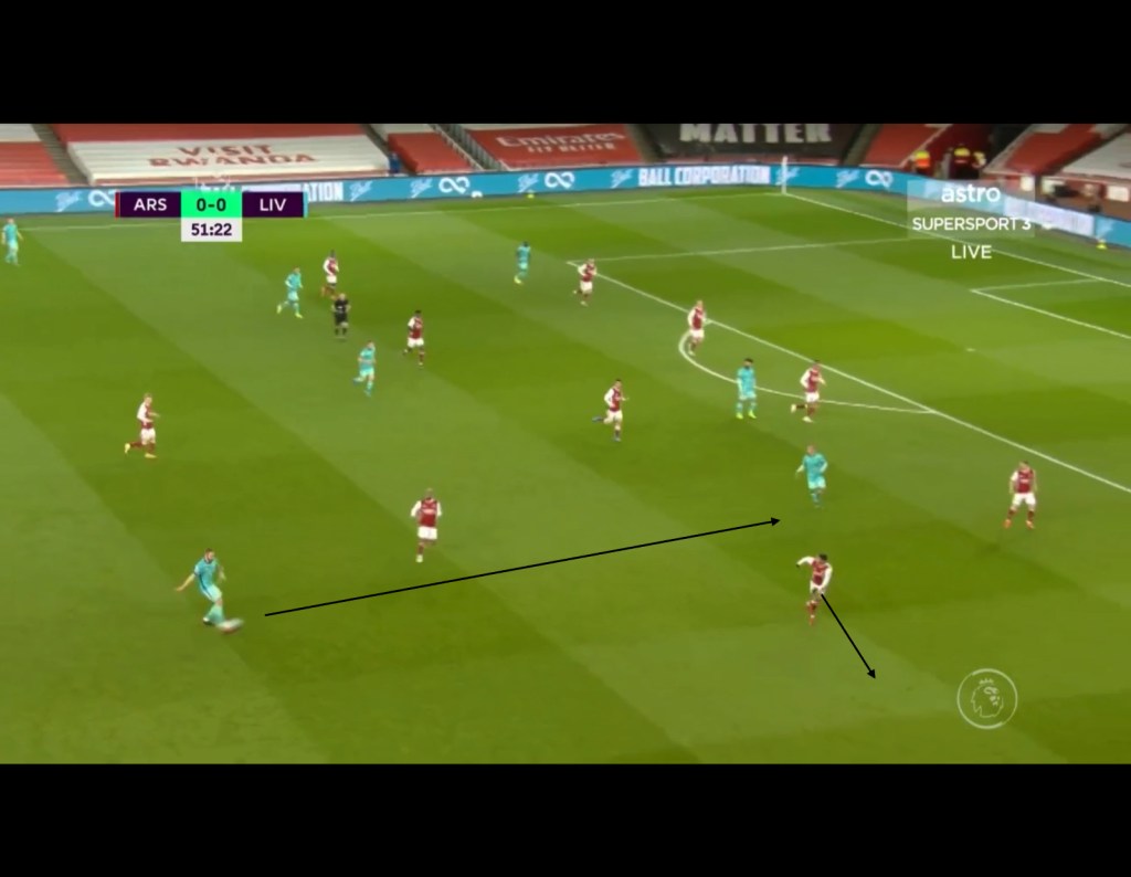 Liverpool exploited Aubameyang’s orientation to the full-back and the 2nd lines shifting to play balls into the half space. They did this through Roberto Firminio dropping deeper with Thiago shifting out wide as Trent would keep the width and occasionally advance forward. This manipulated the positioning of Dani Ceballos as whenever Thiago was in possession, Ceballos would press his compatriot. This combined with poor shifting from Partey created space for Firminio to receive the ball in the half space due to Arsenal’s lack of horizontal compactness.An example of this can be seen below.