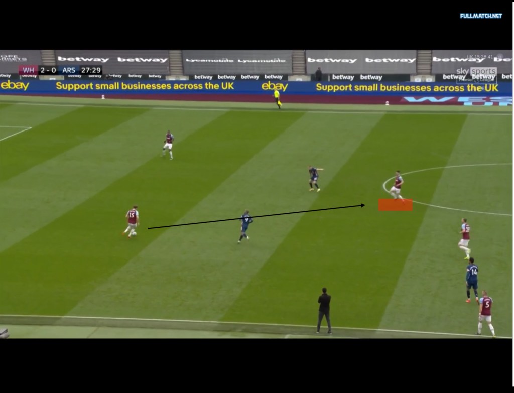 A few seconds later we can see how Aubameyang joins the front 2 but he is the only member of the 2nd line to do so and a clever pass by Cresswell between Odegaard and Aubameyang meant Rice had acres of space to run into. There were several mistakes in Arsenal’s approach, with the first one being the fact that the 2nd line didn’t push up to support and cover the front. This led to the creation of the gap between the lines and thus reduced the 2nd lines access to the ball carrier. The next mistake came from The fact that Partey decided to orient himself towards Benrahma on the left wing, even though Aubameyang’s cover shadow would have prevented a pass to the Algerian, and this gave rice even more space to run into when he received the ball. Although, in Partey’s defence it can be argued that had Chambers, the RB, marked Benrahma the Ghanaian may have pushed forwards and provided cover.